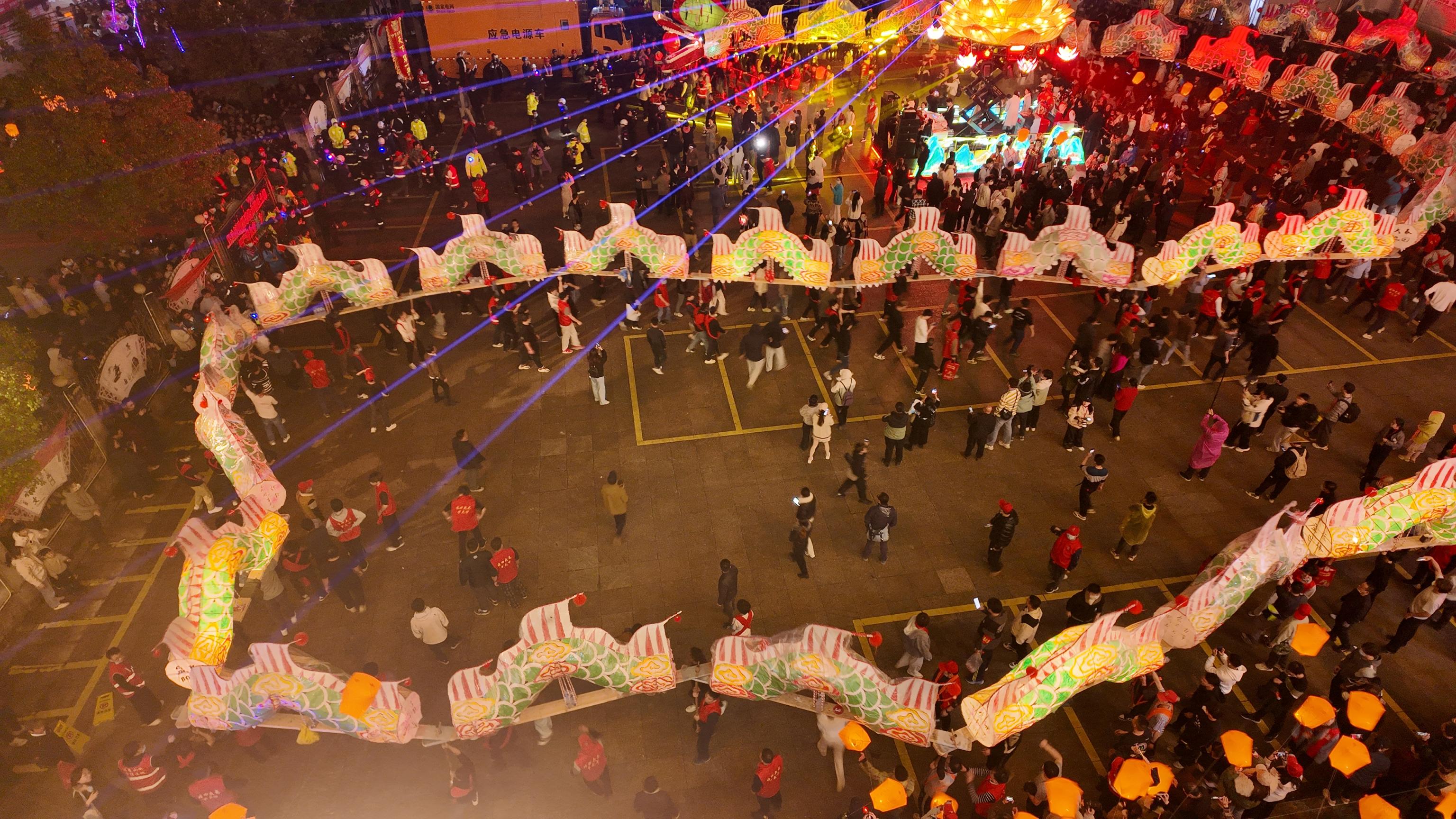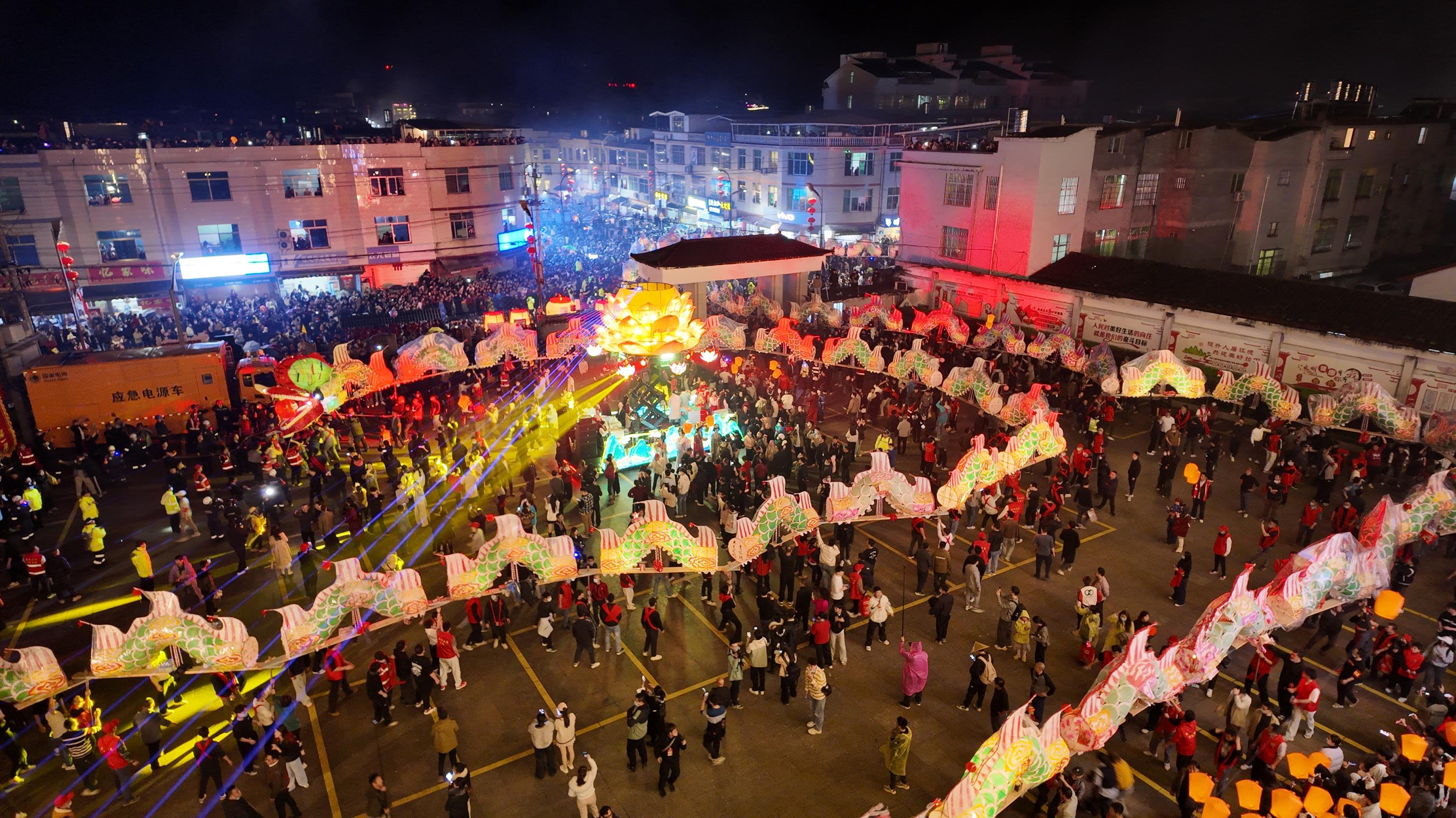 大龙在镇上走街串巷,焰火与灯光赶走夜色,家家户户上街共庆元宵
