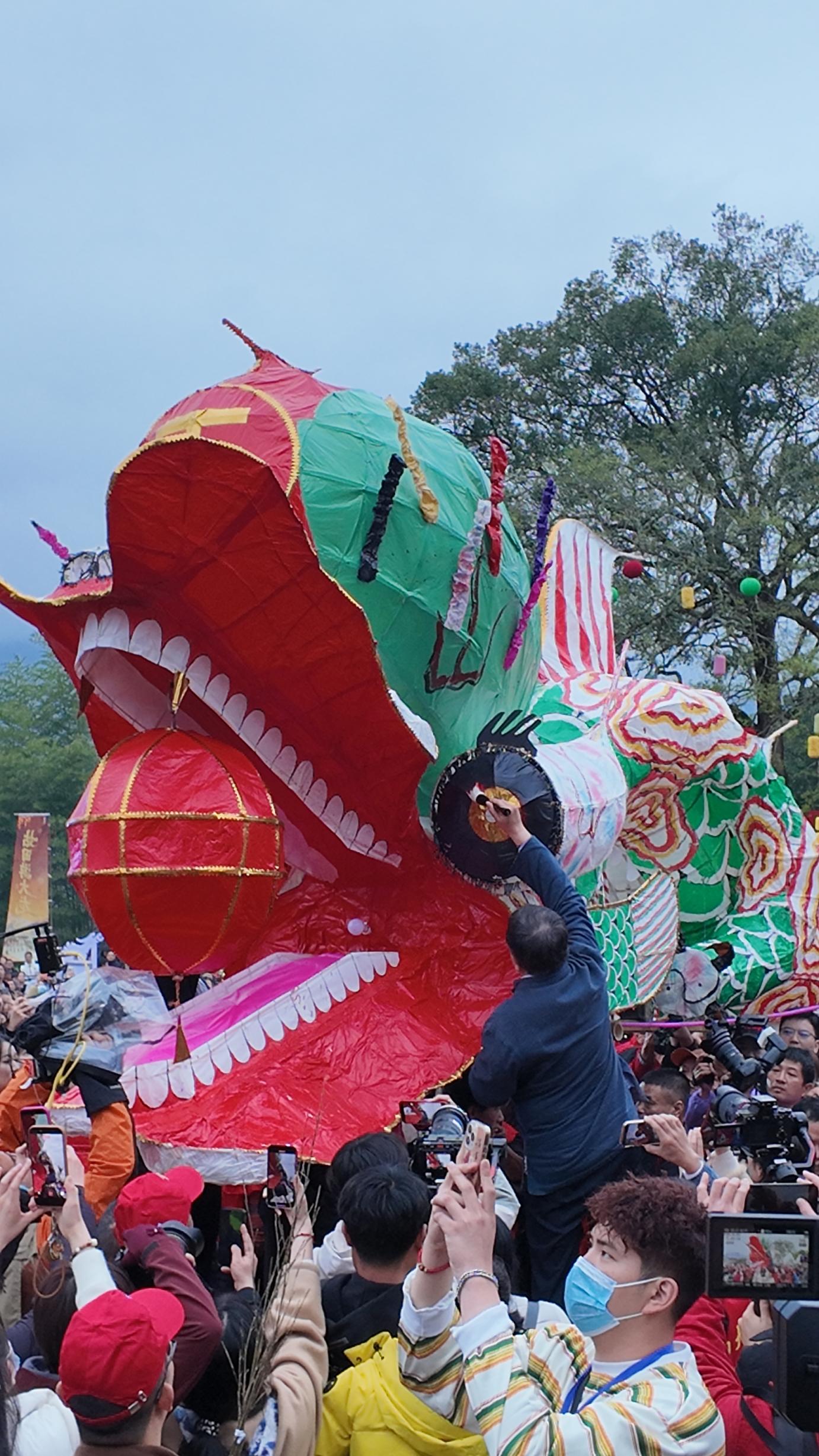 点睛之后,大龙188节龙身依次跃起,随着抬龙队伍的接力前行,如有灵一般游向山野田间、民居巷陌。“人寿年丰”“福寿安康”“龙腾盛世”“福满人间”……村民们挥墨在龙身上的祝福也四溢流淌开来。