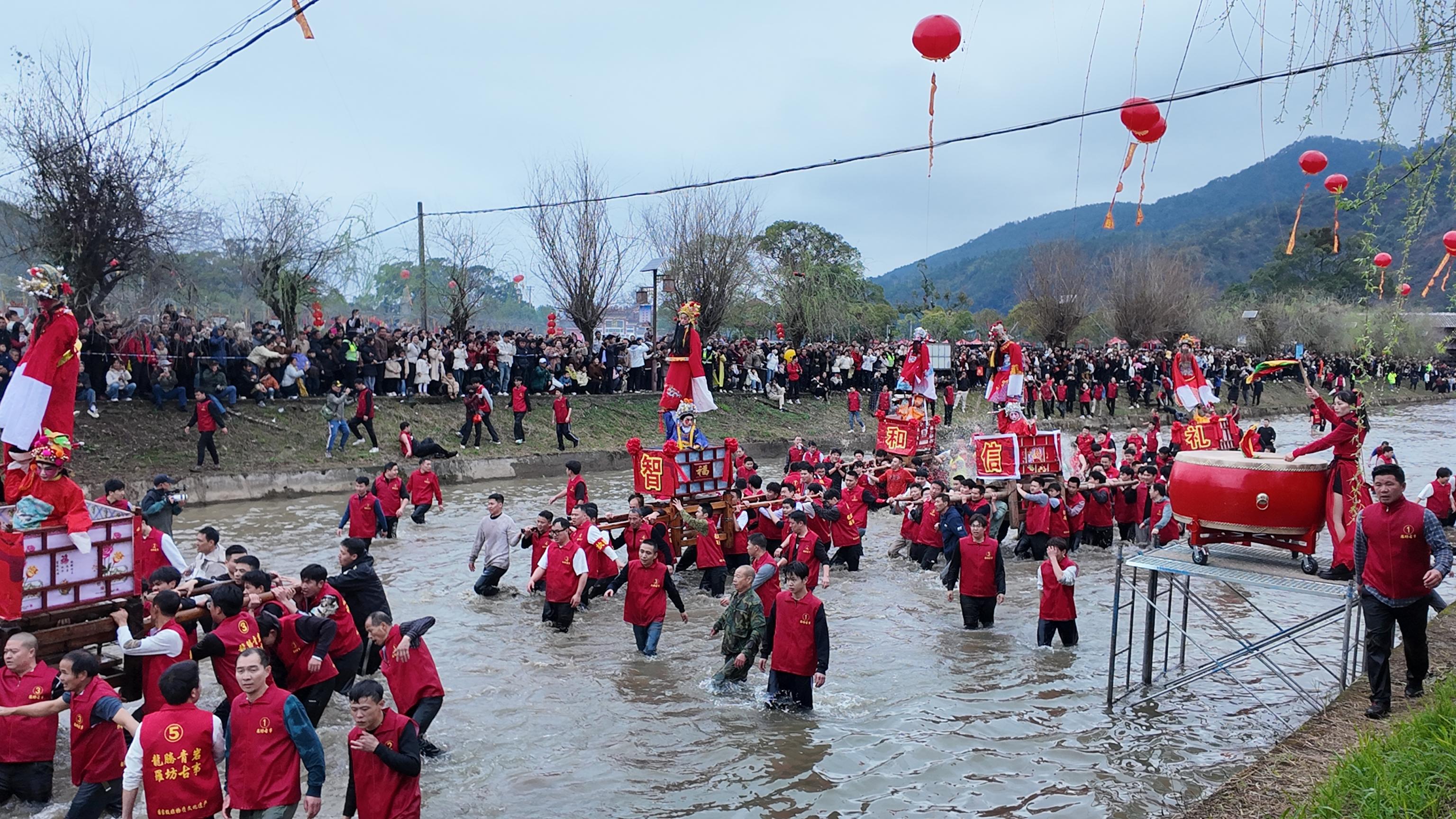 “走古事”是已有三百余年历史的客家元宵盛会,特制轿子搭载两名身穿戏服、脸化油彩扮作经典历史人物的男童,称古事棚,青壮年肩扛“忠、义、仁、智、礼、信、和”七个古事棚陆上疾走、逆水竞速,以此祈愿来年风调雨顺、五谷丰登。锣鼓节奏中呐喊震天,水花四溅而起,古事棚队伍在镇上巡游一圈后终于下水,场面激烈却有序,人们簇拥着自己的古事棚在水里艰难前行,不少人与伙伴携手而行,任河水牵绊,始终步调一致、合力向前。