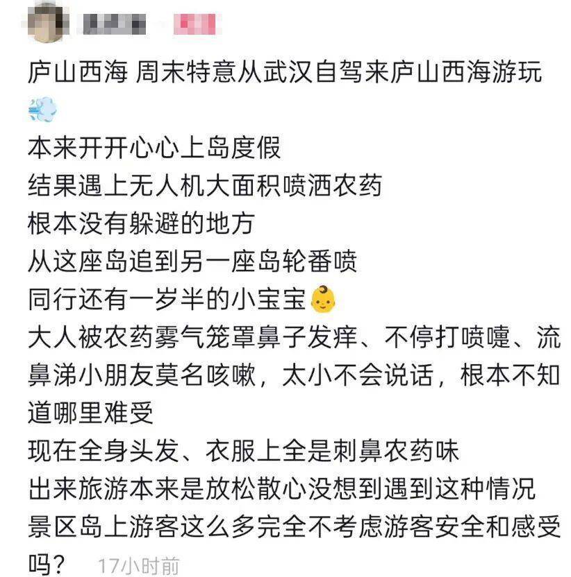4月25日,网友称在江西九江庐山西海景区游玩时,景区岛屿上有无人机喷农药,画面中一架无人机疑似以较低的飞行高度掠过,喷洒不明物质,期间疑似有游客被喷到,事件引发讨论。