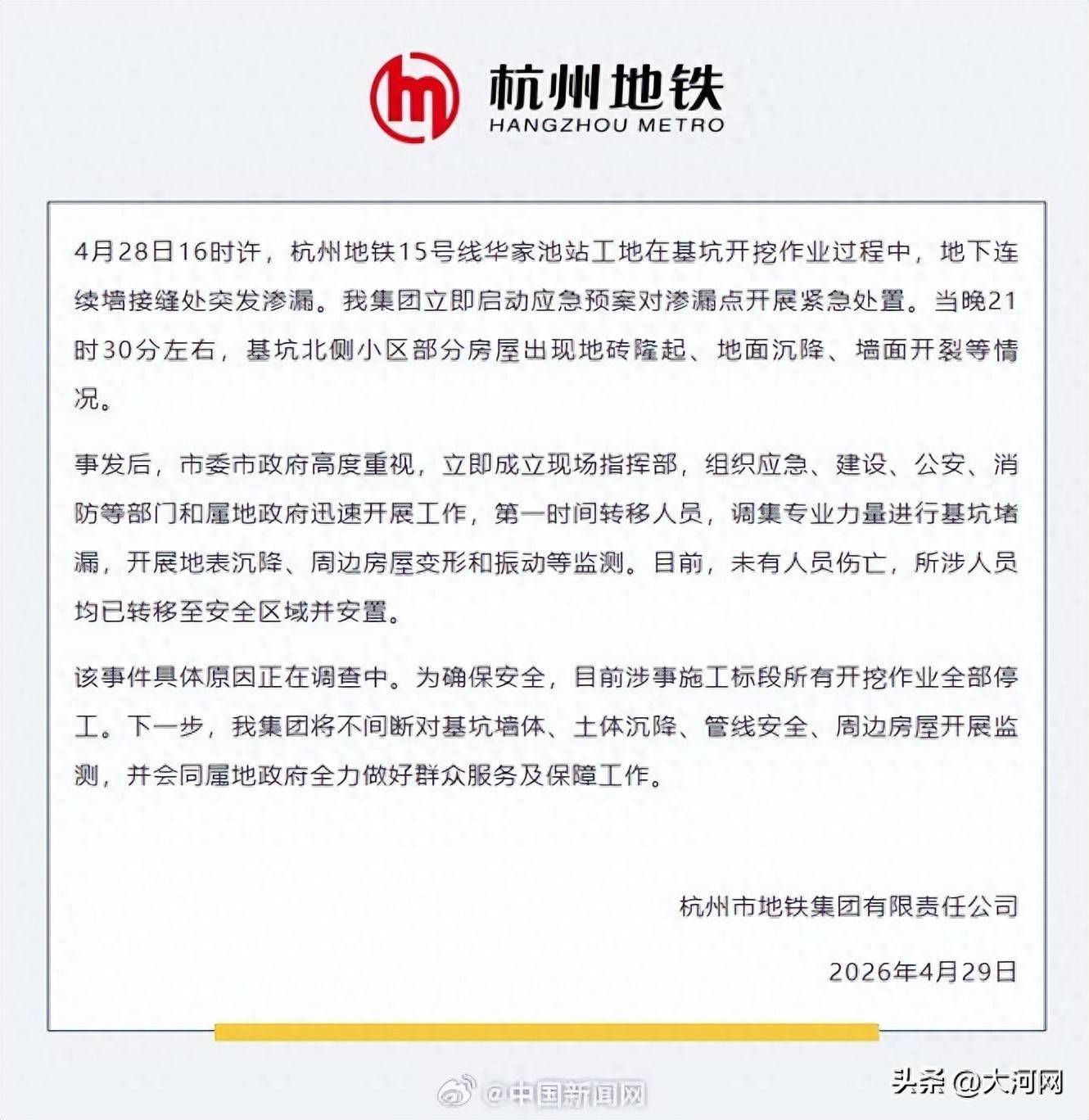 4月29日,杭州地铁发布情况通报:4月28日16时许,杭州地铁15号线华家池站工地在基坑开挖作业过程中,地下连续墙接缝处突发渗漏。我集团立即启动应急预案对渗漏点开展紧急处置。当晚21时30分左右,基坑北侧小区部分房屋出现地砖隆起、地面沉降、墙面开裂等情况。