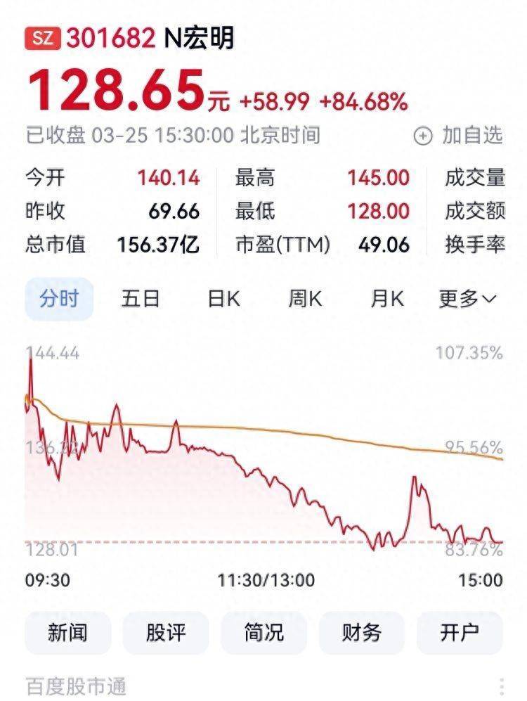 上市首日,宏明电子开盘价140.14元/股,较发行价69.66元大涨101.18%,最高145.00元,最低128.00元,收盘报128.65元,涨84.68%,总市值156.37亿元。
