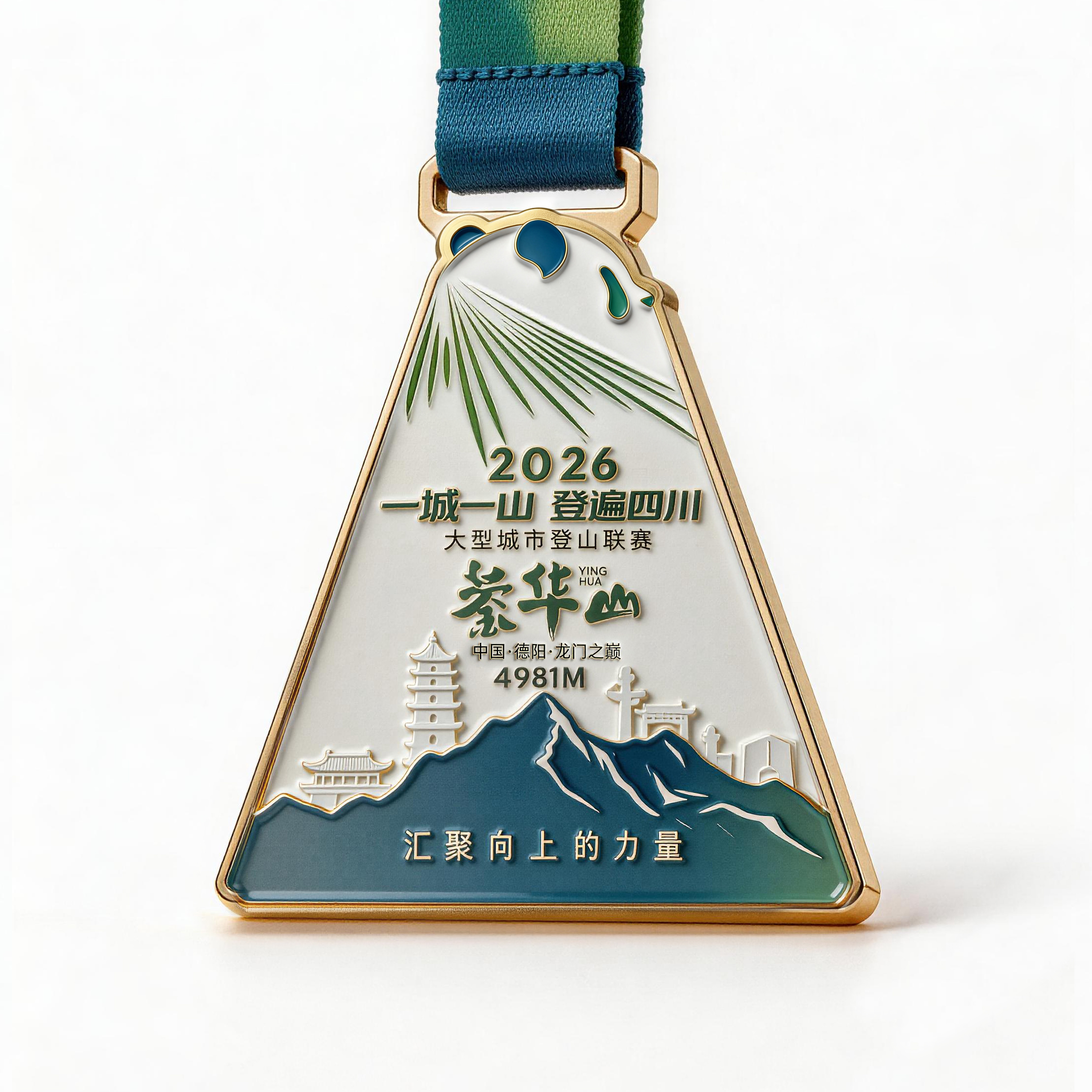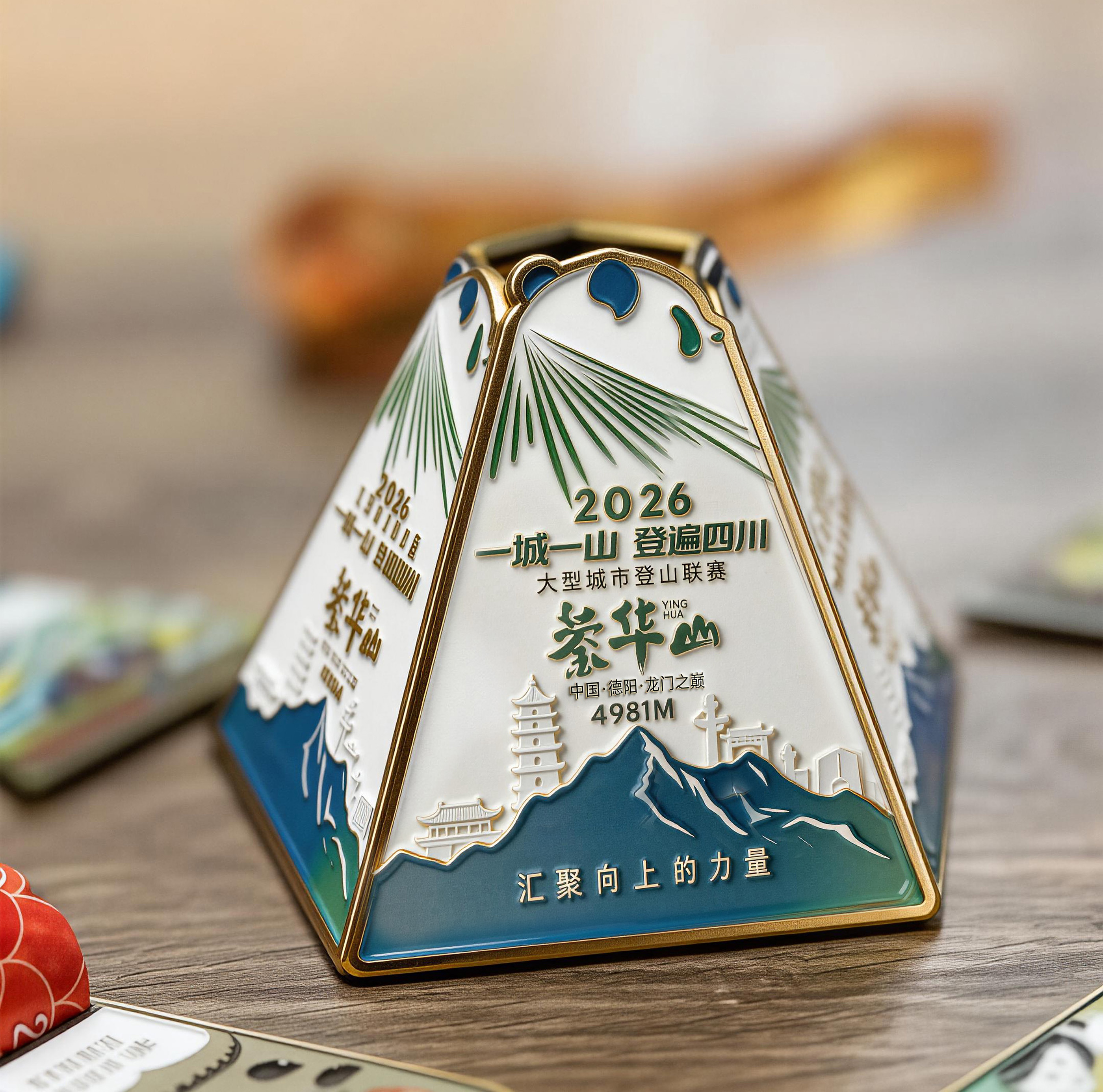 与LOGO相呼应的“登超”奖牌,同样以“汇聚向上的力量”为主线,以极简几何线条勾勒出山峰轮廓,传递户外赛事环保健康的理念。最具巧思的是,奖牌采用可拼合的山脉形态设计——多人组队打卡不同山峰,可将各自奖牌拼合成完整的“团队攀登版图”,让集体记忆可视化;单人完成多峰挑战,亦可自由排列组合,打造专属“登山成就墙”。从单块徽章到拼合后的山脉全景,激发更多人加入“登遍四川”的行列。